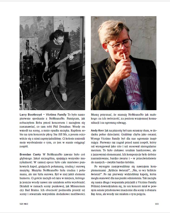Jest wiele zespołów, muzyków, artystów, którzy w znaczący sposób wpłynęli na moje życie artystyczne i zawodowe – ale chyba nie ma bardziej znaczącego niż kanadyjskie NoMeansNo. Ich płyty i koncerty z lat dziewięćdziesiątych były jak tornado wkręcające się w nasze głowy. Długo myślałem, że to zauroczenie dotyczyło wąskiej grupy nakręconych młodzieńców, której byłem wtedy częścią. Po lekturze tej książki dowiesz się jednak, jak wielu osób dotyczy ta fascynacja i jak istotnym źródłem inspiracji muzycznych było NoMeansNo dla niezliczonej ilości muzyków na całym świecie. – Artur Maćkowiak (Something Like Elvis, Innercity Ensemble, you.Guru)