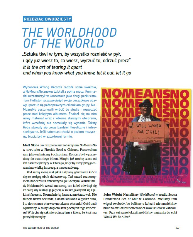 Pierwszy raz zagrali w Polsce 23 kwietnia 1989 roku, w dniu moich dwudziestych urodzin, i był to jeden z najlepszych prezentów, jakie w życiu dostałem. NoMeansNo otworzyli mi oczy i pokazali, że punk rock może być nie tylko muzyczną ilustracją nastoletnich rozterek, ale też i bardziej dojrzałą formą konfrontacji z niegodziwościami tego świata. Później skumplowaliśmy się i często spotykałem ich na koncertach. Za każdym razem było to zabawne i inspirujące doświadczenie. Cholernie dużo im zawdzięczam! – Wojtek Kozielski (autor, „Weltschmerz Hardcore”)